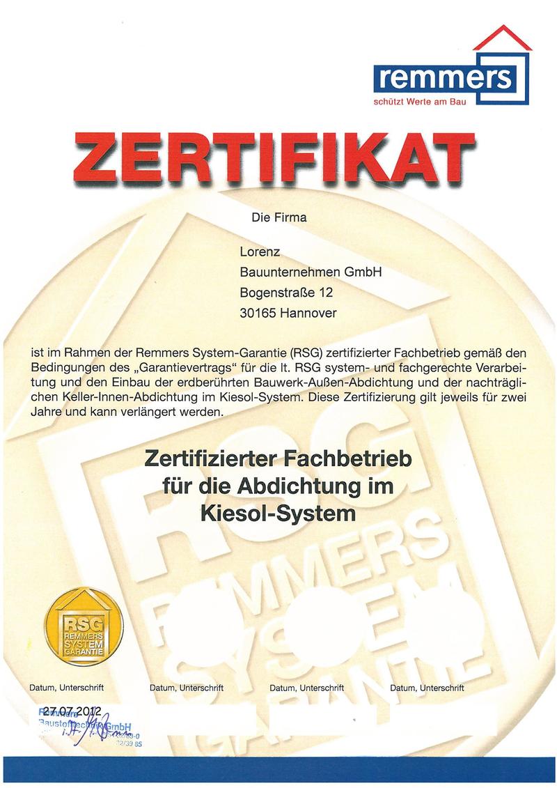 Zertifikat-Remmers erdberührte Bauwerksabdichtung