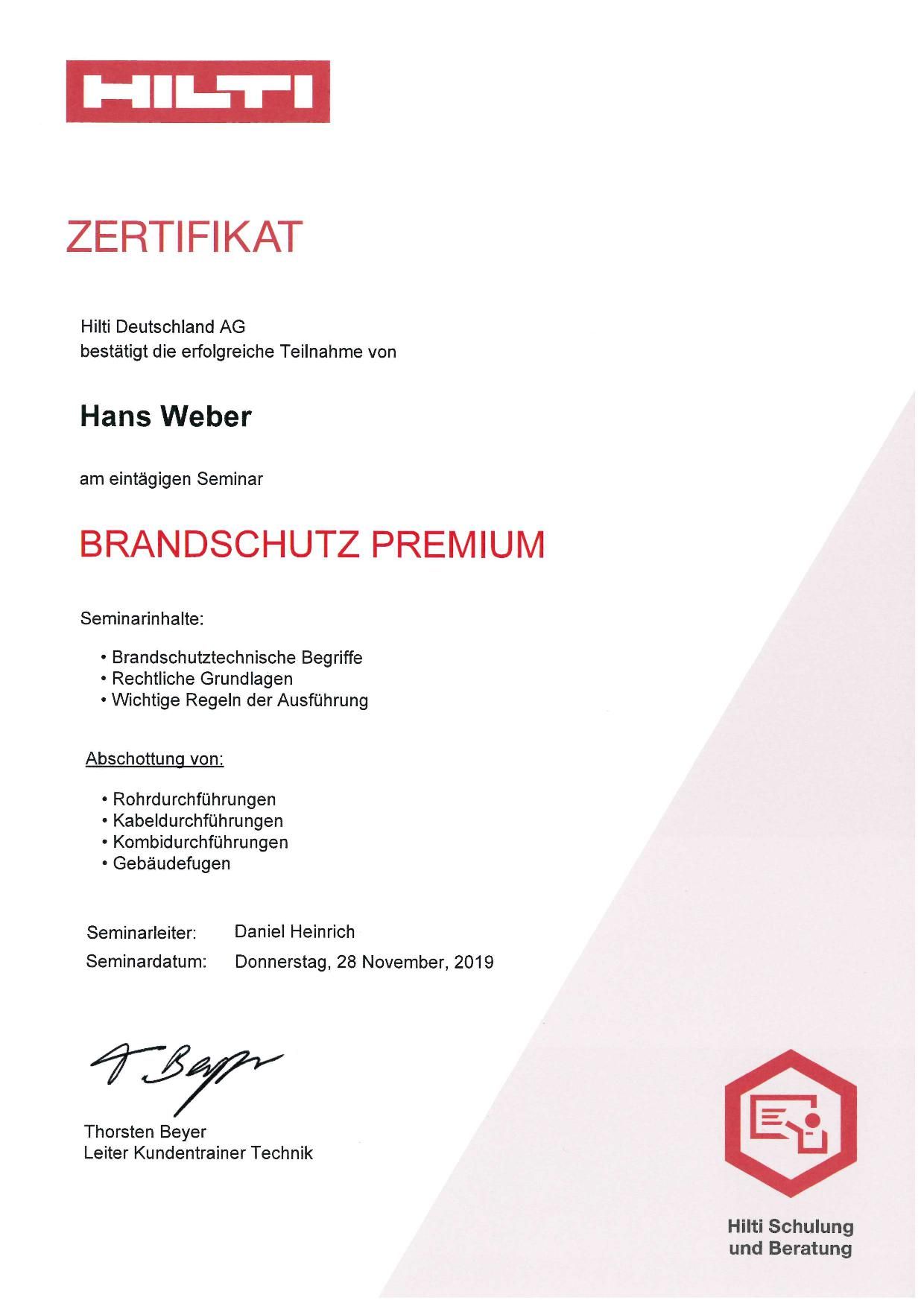 Zertifikat Hilti Brandschutz Premium 2019 - Weber