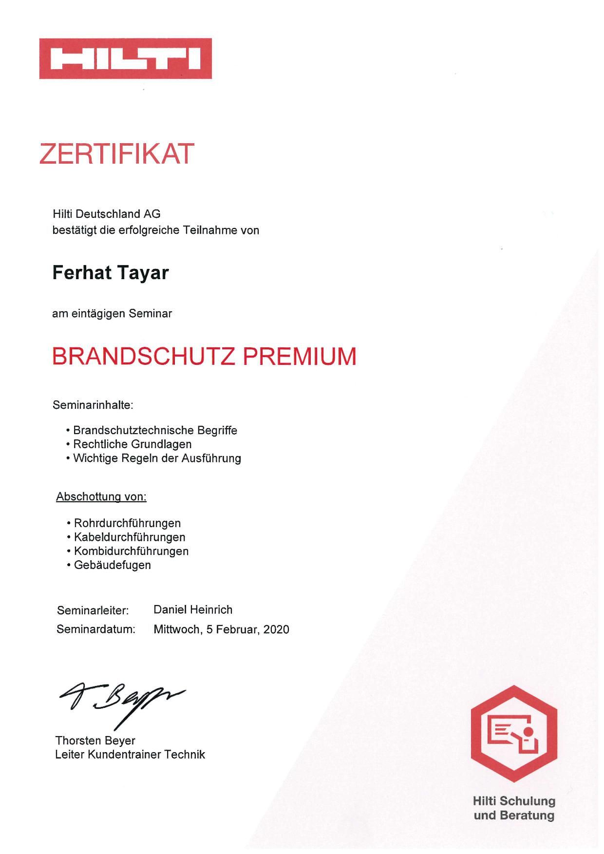 Zertifikat Hilti Brandschutz Premium 2020 - Tayar